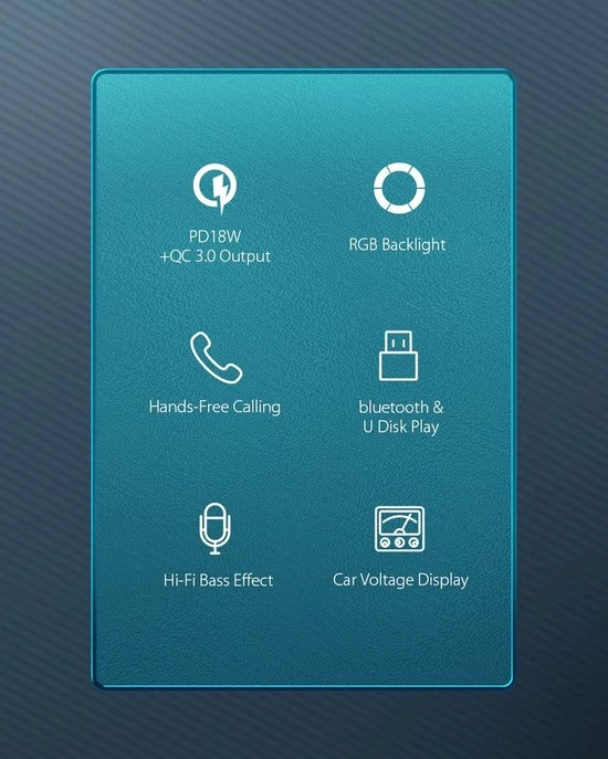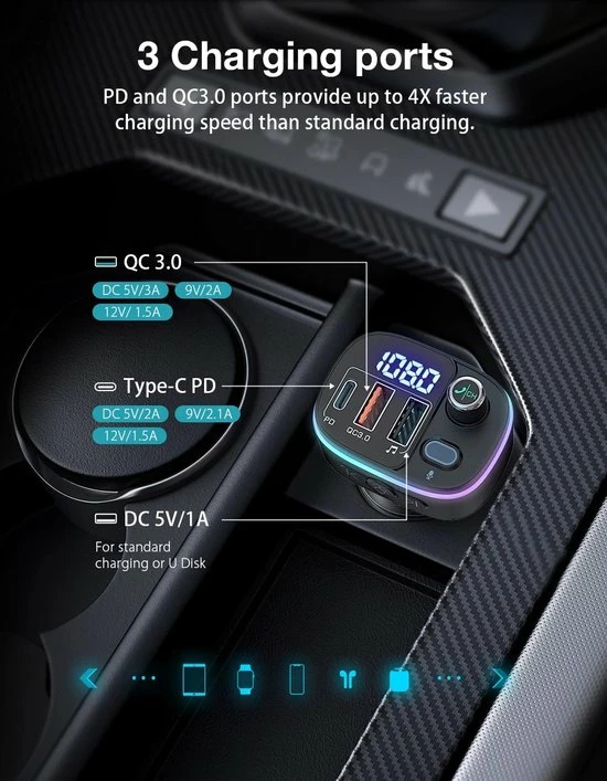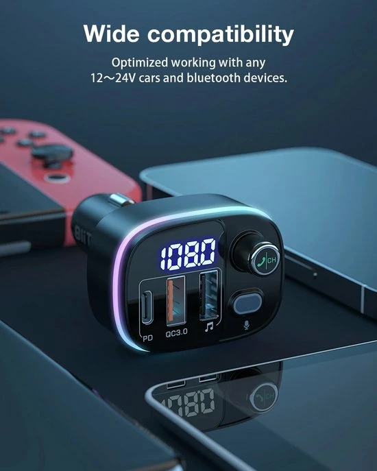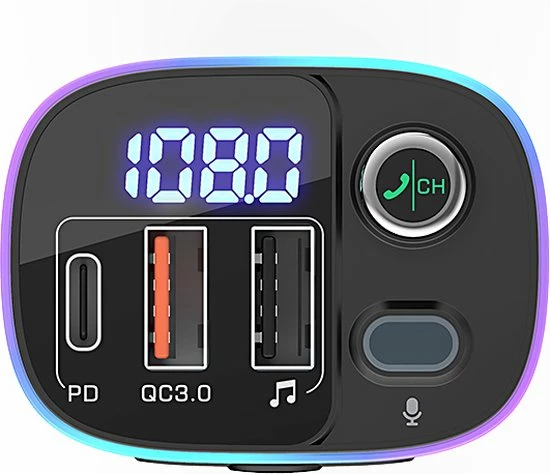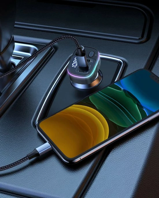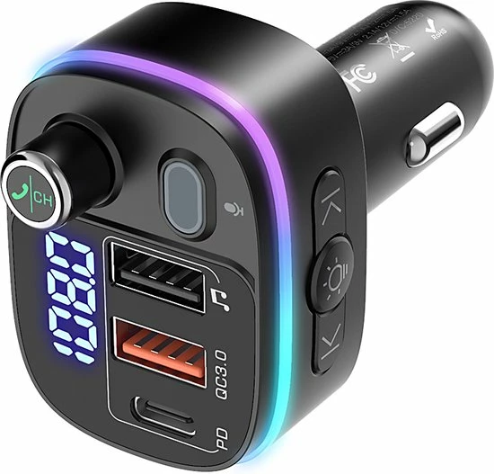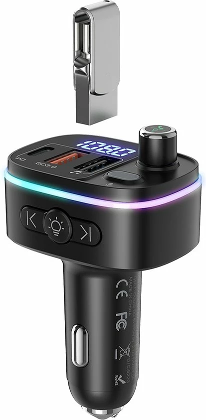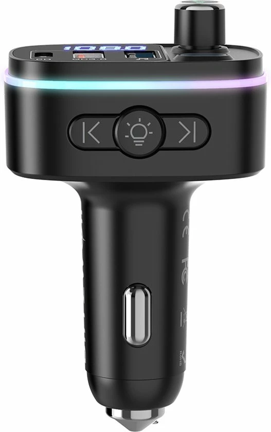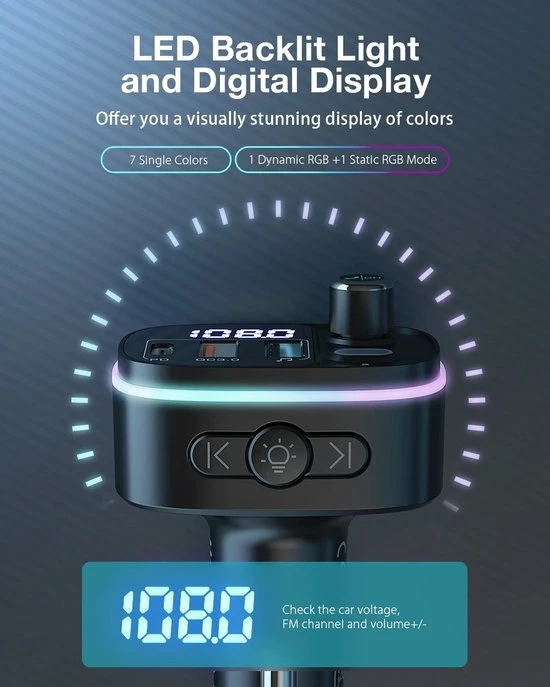 De auto-FM-zender is uitgerust met 7-kleuren LED-verlichting: Rood, Groen, Blauw, Oranje, Paars, IJsblauw, Wit, 1 dynamische RGB, 1 statische RGB. Dan zie je in het donker de lichtknop en pas je de gewenste kleur aan. Vergemakkelijk de bediening en veiliger rijden tijdens het rijden ‘s nachts.
