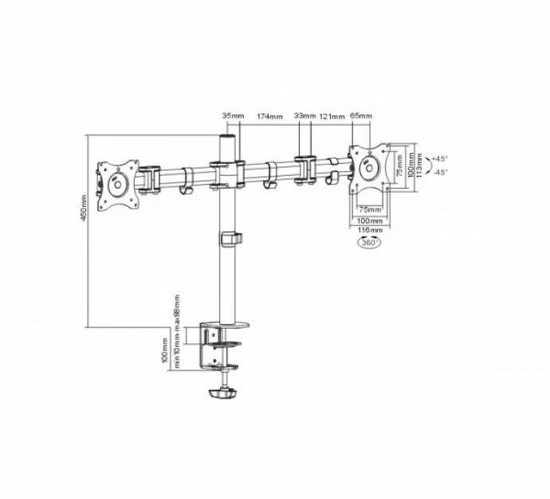 CUC Exertis Connect 903038. Type mobiele apparatuur: Beeldscherm, Correct gebruik: Binnen, Soort: Passieve houder. Pivot hoek: 0 – 180?, Draaihoek: 360?, Draaihoek: 45?. Minimumafmetingen schermcompatibiliteit: 33 cm (13”), Maximumafmetingen schermcompatibiliteit: 68,6 cm (27”). Hoogte: 450 mm. Maximale gewichtscapaciteit: 8 kg, Montagewijze: Bureau