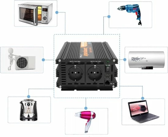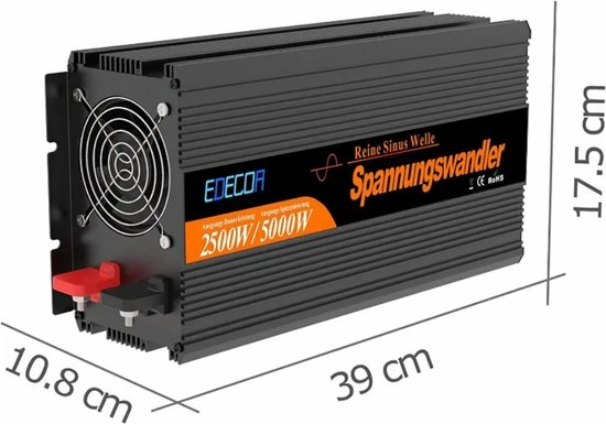 - Pure sine golf & stabiele uitgang. DC naar AC Power Inverter 12V 230V kan 2500W continu vermogen of 5000W max piekvermogen leveren. Aangedreven door bipolaire SPWM, is de sinusvormige uitgangsgolfvorm zuiverder, THD