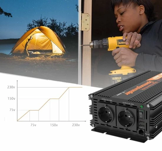 Wilt u ook graag uw camping-koelkast aansluiten in de auto? Of wilt u misschien een paar tv-schermen aansluiten voor op de camping? Met deze handige omvormer kunt u eenvoudig verschillende 230V apparatuur aansluiten met maximaal 2500W vermogen. Ideaal voor als u naar de camping gaat, of een lange reis wilt maken naar het buitenland. U kunt zo handig een koelkast meenemen of overige apparatuur zoals een laptop. Ook handig voor in de caravan of camper.