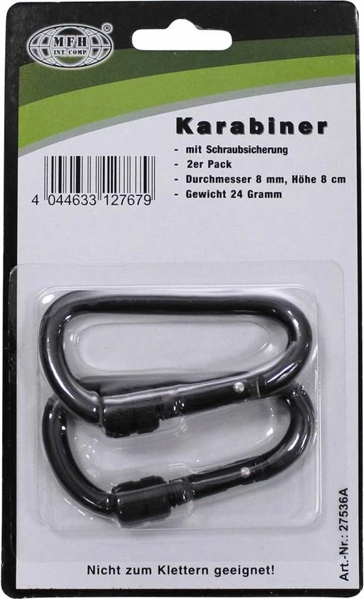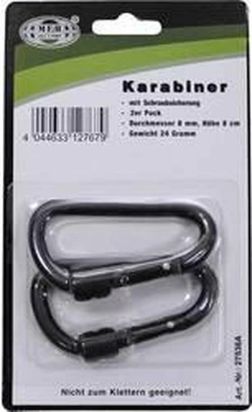 Praktische karabijnhaak met schroefsluiting voor het eenvoudig bevestigen van accessoire op bijv. een rugzak, riem, tent stang en nog veel meer. Niet geschikt voor het klimmen of abseilen van personen. De teksten voor dit artikel zijn automatisch vertaald.