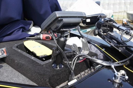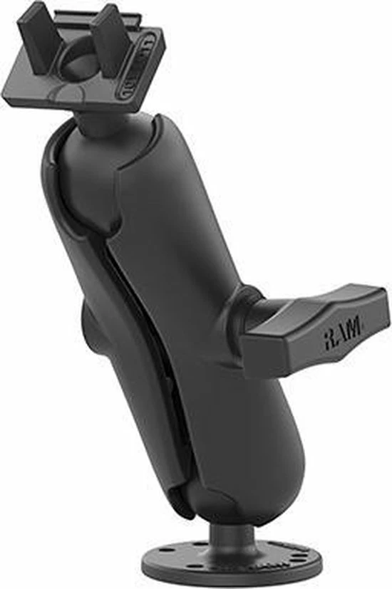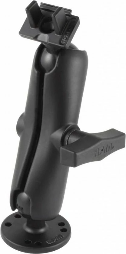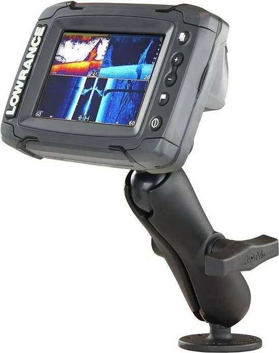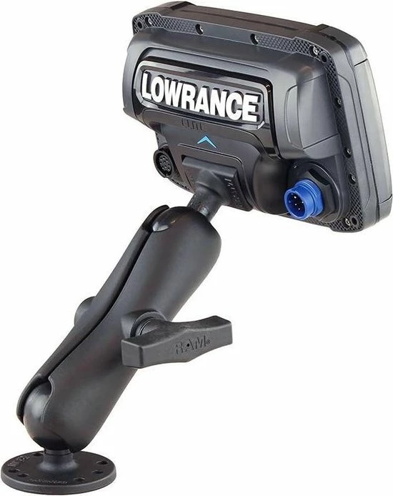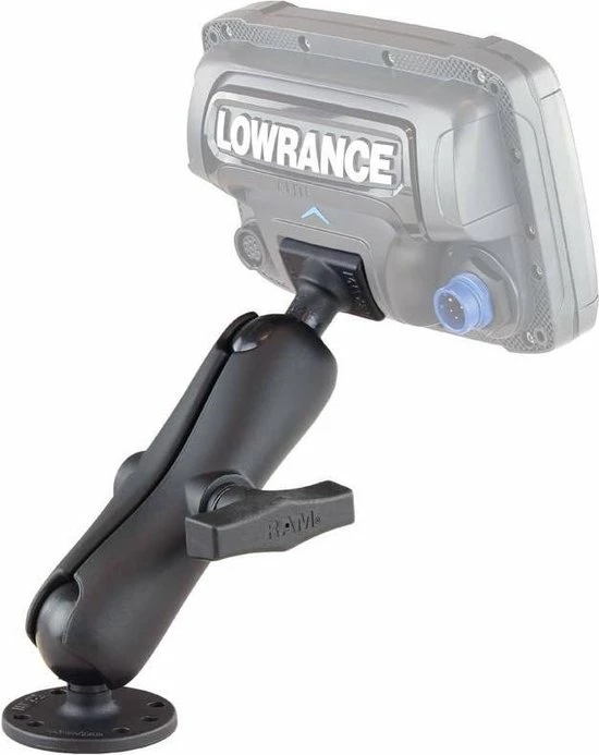The RAM-101-LO11 consists of a 2.5″ diameter round base that contains the universal AMPS hole pattern double socket arm and adapter base that inserts directly to the back of Lowrance Elite-5, Mark-5 and Hook-5 Fishfinders. The adapter serves as a quick release mechanism, allowing you to remove or transfer your Fishfinder in seconds. Designed into the mount is a 1.5″ diameter patented rubber ball and socket system with adjustment points at both socket ends of the arm; this with RAM’s rubber ball and socket technology allows for almost infinite adjustment and perfect viewing angles.