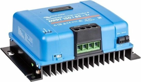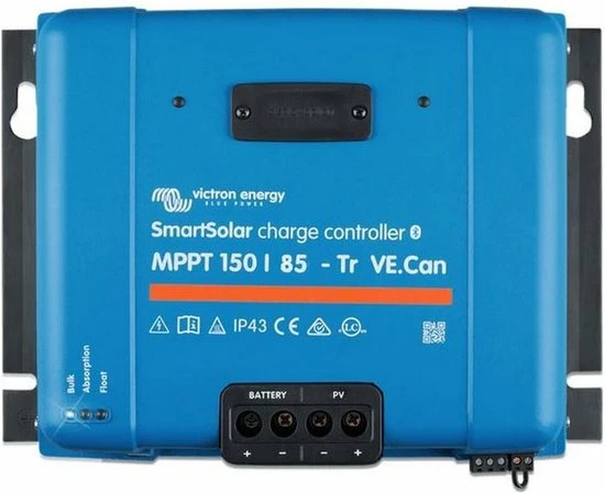 Victron SmartSolar MPPT 150/85 12/24 (autoselect) /36/48V is een zonnelader voor bij een 36V systeemspanning is dat 3600W, en bij een 48V systeemspanning is dat 4900W12/24/36/48V systemen. Het maximaal nominaal PV-vermogen dat bij een 12V systeemspanning door de zonnelader wordt doorgegeven is 1200W, bij een 24V systeemspanning is dat 2400W bij een 36V systeemspanning is dat 3600W, en bij een 48V systeemspanning is dat 4900W. De maximale PV-nullast-spanning van deze zonnelader is 150V .De maximale PV-nullast-spanning van deze zonnelader is 150V De SmartSolar zonne-laadregelaars hebben een programmeerbaar acculaad-algoritme, en standaard Bluetooth Smart ingebouwd om de zonnelader te kunnen instellen en zonneopbrengst te kunnen monitoren. Met VE.Can of Bluetooth kunnen tot 25 zonneladers in serie gezet worden, en verbonden worden met een Color Control GX of ander GX-toestel. Elke Regelaar kan individueel beheerd worden, bijvoorbeeld met een smartphone of iPad (Bluetooth) of met een Color Control GX (VE.Can) en dan eventueel ook op de VRM-website.